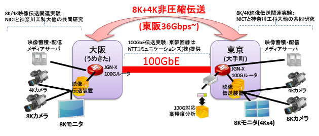NICTでは、新世代ネットワークの実現等に向けた研究開発用テストベッドネットワーク「JGN-X」を構築、運用しており、今回は、昨年成功した100G伝送実験成果を踏まえ、以下の実証実験を行いました。