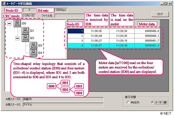 The developed radio device is surely compliant to the radio specifications in the current IEEE 802 standard draft where NICT had contributed. One of the remarkable points of the device is low-power multi-hop transmission management capability that automatically and autonomously constructs data collection/circulation topology among meters when they are turned on, in which any pair of communicating devices synchronize with each other in the very short periods for data listening/ receiving and transmitting thereby achieve one hundredth lower power consumption than the conventional case without synchronization. Such a low-power performance confirms the possibility of long-lived battery-powered operations for several years without battery replacement.