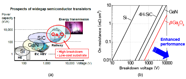 Figure 1(a) shows the prospects of Ga2O 3 and other power semiconductors as predicted from their material properties. Ga2O3 power devices will initially be targeted toward high-voltage and high-power applications. As Ga2O 3 devices become more established, their applications will broaden to those of SiC and GaN by virtue of their simple and low-cost substrate production.