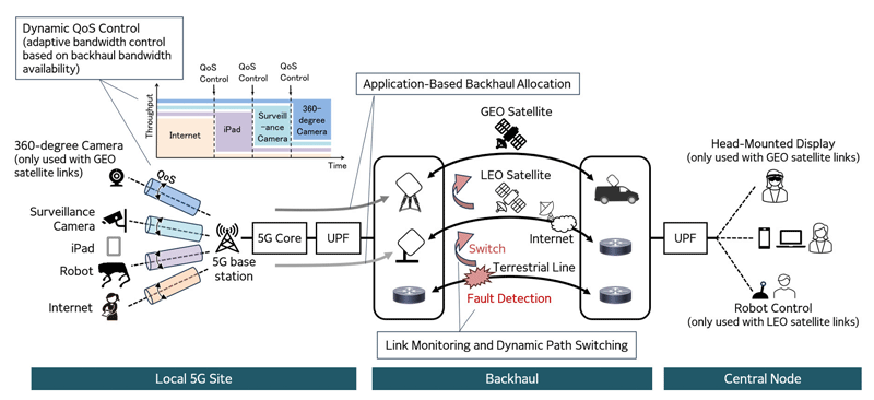 The participating organizations jointly built and tested a network integrating a GEO satellite, LEO satellites, and local 5G systems. The demonstration validated next-generation communication technologies, including link monitoring, dynamic path switching, application-based backhaul allocation, and adaptive QoS control based on bandwidth availability. A simulated disaster scenario was also conducted to assess the feasibility of a flexible network infrastructure combining satellite and 5G technologies. All trials were successfully completed, confirming both the effectiveness of end-user communications and the potential to enhance the reliability of future social infrastructure through sustainable, adaptable networks that meet diverse communication needs.