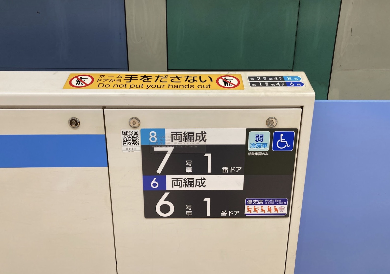 ホームドアに表示されているQRコード。駅係員の連絡用スマートフォン にインストールされているアプリで、このQRコードが乗車位置と連携している