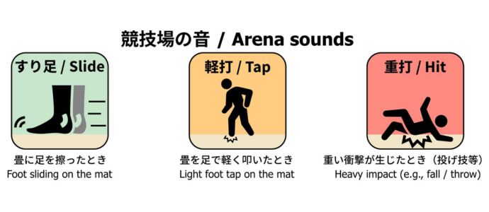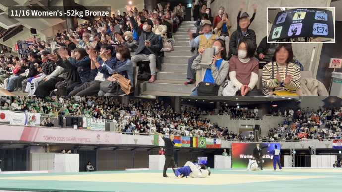 今回の東京デフリンピック2025では、柔道の試合で使わせていただきました。試合を単に「見る」だけでなく、柔道特有の擦り足や、重打、軽打の3種類の音を「Hapbeat」を通じて振動に変換し、観客に伝えました。東京武道館で4回ほど実地検証を行いましたが、動作を自動かつ極力低遅延で判別する必要があり、その点にはかなり試行錯誤を繰り返しました。当初は機械学習*3を用いたアプローチを想定していましたが、検討を進める中でリアルタイム性が求められる今回のケースにおいては、現実的ではないと判断しました。本番環境が不明確であること、および数十ミリ秒の遅延でもリアルタイム用途では大きな問題になることから、本番で安定した精度を確保するのは難しいと判断したためです。実証実験の2回目には、どのように検知してHapbeatと連動させるか、大まかな見通しが立ちました。