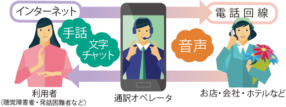 相手方が応答すると、通訳オペレータが「こちらは電話リレーサービスです。耳のきこえない方などからのお電話を通訳しております。双方のお話を全て通訳いたします。よろしくお願いします。」と案内して通話を開始します。通訳オペレータは、利用者である聞こえない人の手話・文字を相手方となると聞こえる人に音声で、相手方の音声を手話や文字にして聞こえない人に伝えます。