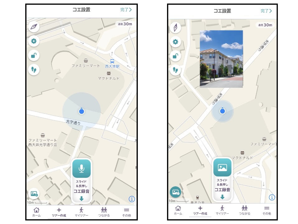たとえば、場所を伝えたい人(支援者)が利用する人のことを想像して、歩きながらガイド音声をアプリにつぶやきながら案内すると、その音声が位置情報と連動します。当社はこれを「音声ナビガイド」と呼んでいます。その場所に行きたい利用者は、支援者がつぶやいて出来上がった音声ナビガイドをたよりに進むことができます。「この先まっすぐに進むとコンビニエンスストアがあります」といった景色情報と連動した音声や、利用する人の特性に合わせて、「このあたりは車が多いから気を付けてね」などの情報に従って進むと、スマホ上の地図を見る機会を減らしながらその場所にたどり着けます。アプリ上で伝えられた音声情報と、目の前の景色は同じであることと、拠点に到着するまでの30m以内には、次の音声ガイドによるナビゲーションを検知する仕組みを設けているため、支援者が常に寄り添ってくれる感覚が得られ、”地図を見ながらの歩行”を抑える仕様にできあがっています。表示される景色は実際の景色と同じなので、視認性も高くなっています。利用者は、この音声ナビガイドを作った人が声を通じて”誰であるか?”がわかるため、利用する人との関係性・情報への信頼とともに、一緒に歩きながら外出しているような安心感も得られます。