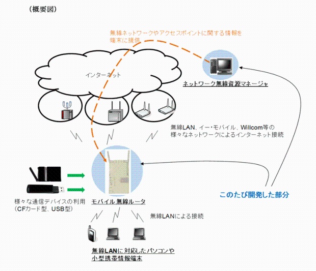 独立行政法人情報通信研究機構(以下「NICT」という。理事長:宮原 秀夫)は、IEEE 1900.4仕様に準拠したモバイル向けの無線ルータ(以下、「モバイル無線ルータ」という。)を開発しました。モバイル無線ルータは、電波利用状況及びネットワークマネージャの支援情報に基づき、接続可能な複数の無線アクセス方式の中から最適なものを自動的に選択し、インターネットに接続します。一方で、端末に対しては無線LANアクセスポイントとして動作し、インターネット接続環境を提供します。