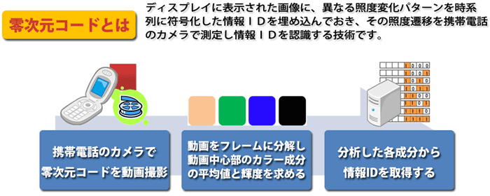 零次元コードは、撮影されたアイコン映像を再撮影してコピーしたものではコードの識別はできなくなるため、不正なアクセスを防ぐことができます。利用者は、使い慣れた自分の携帯電話で、簡単に電子看板を操作できるようになり、一方、電子看板の管理者は、キーボードやマウスなどの入力装置を設置しなくても幅広いインタラクティブなサービスを容易に導入し、安全に提供できるようになります。