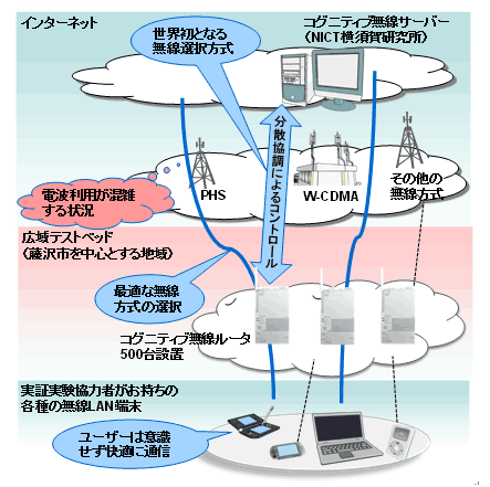 NICTでは、安心・安全な社会の実現に向けた無線ネットワークに関する研究開発の一環として、あらゆる端末が広域に展開されたコグニティブ無線システムを用いて自由に無線インターネット接続ができる社会インフラの実証実験を計画しています。このコグニティブ無線システムはNICTが研究開発を進めてきたものであり、電波利用状況に応じて最適なインターネット接続方式が選択されるため、利用者は複数の接続方式を意識することなく、無線のみでインターネット接続が可能になります。しかし、社会インフラとしての実証はこれまで行われていないため、NICTは財団法人藤沢市産業振興財団と共同研究契約を締結し、実証実験を行うことにしました。