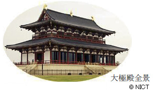 奈良時代の前半には、朱雀門を入った正面のところに、朝堂院の建物が二棟ずつ左右対称に配置され、その奥に大極殿が位置していました。大極殿は天皇の即位、元旦の朝賀など国家的儀式の時に天皇が出御する建物です。平成13年度から、平城宮の中核をなす第一次大極殿の復原工事が行われてきました。