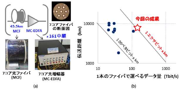 このたびKDDI研と古河電工は、コア間の信号の干渉を十分に抑えることで長距離中継伝送を可能とする7コア光ファイバと7コア光増幅器(図1)を共同開発しました。さらに、最新の毎秒100ギガビット波長多重伝送システムで用いられている偏波多重四相位相変調信号(PDM-QPSK信号)の伝送効率をさらに高めるために、新たな信号処理技術を導入し、従来と比較して伝送効率を2倍に向上することに成功しました。これにより、ファイバ当りの伝送容量を毎秒140テラビットへ拡大すると共に、伝送距離を7,300kmまで延伸することが可能となり、世界初となる毎秒1エクサビット・キロメータの容量距離積を達成しました。この成果は、商用化されている毎秒100ギガビット波長多重伝送システム(伝送容量約毎秒9テラビット、伝送距離約1,500km)と比較すると、伝送容量は約15倍、容量距離積では約70倍向上しています。