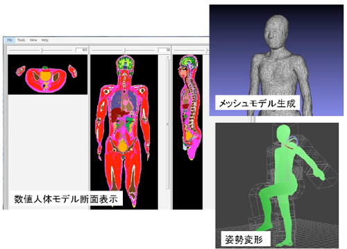 今回公開するソフトウェアでは、数値人体(ブロック型)モデルの内部組織構造の可視化や、ブロック型モデルからメッシュ型モデルの作成等も可能になりました。さらに、過去に公開していたソフトウェアに比べて、より高性能な姿勢変形機能も有しています。