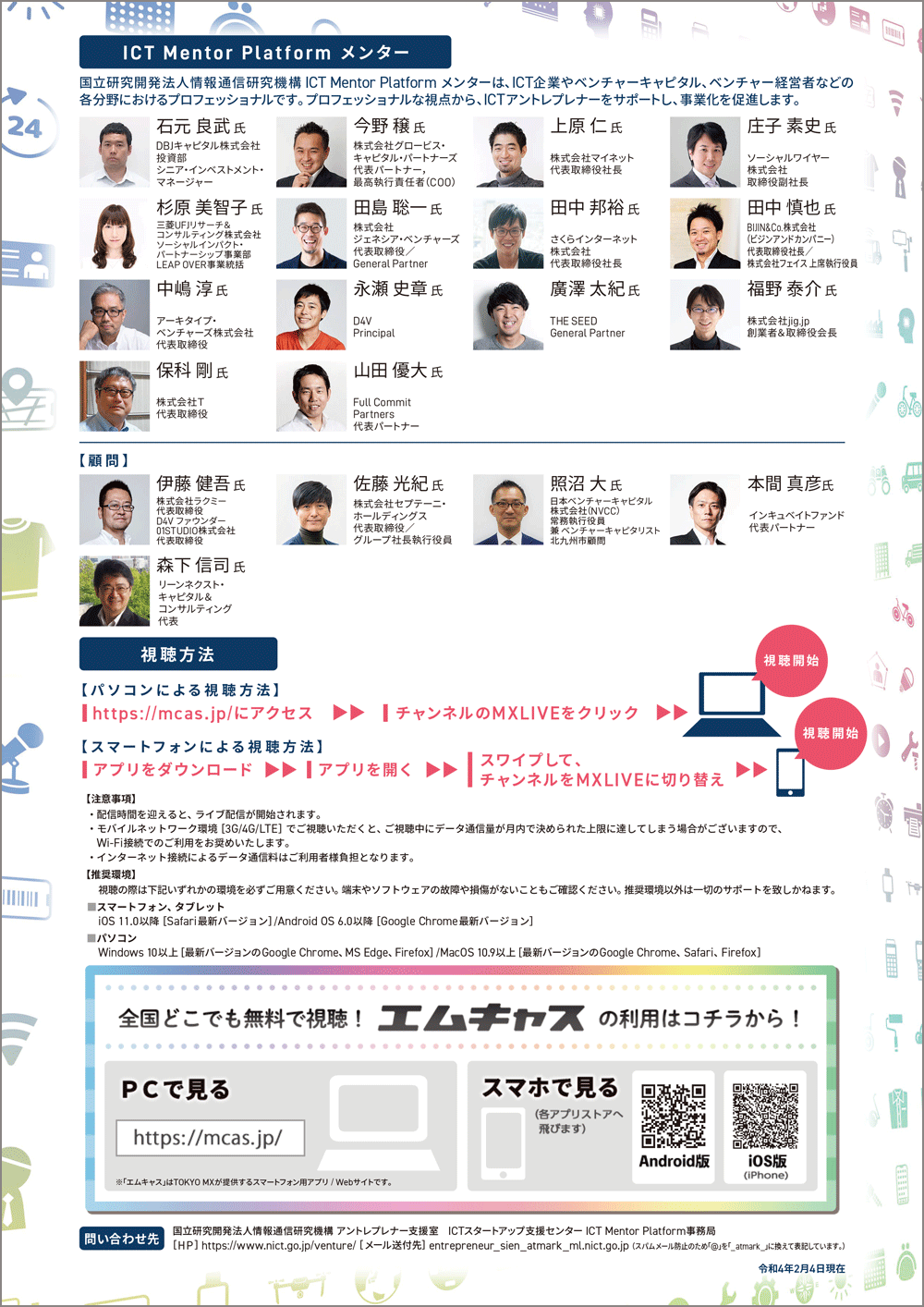 本イベントでは、NICTが有するICTメンターによって各地域の連携イベントから発掘された事業を志す高校生、高専学生、大学生、大学院生等の次世代の人材及び有望な地域発ICTスタートアップが出場し、ICTメンターによるメンタリングにより磨きをかけたビジネスプランを披露します。