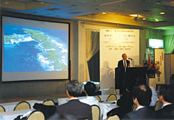 これらの新たな計画に伴い、現在中城村にある沖縄電波観測所の施設では各所の期待に十分応えられなくなってきました。また、周辺一帯で沖縄県の大規模公園計画が進められ、さらに隣接の中城城が「琉球王国のグスクおよび関連遺跡群」の一つとして世界遺産に指定される運びとなり、沖縄県より観測所移転の可能性が打診されてきました。このため、昨年来より移転候補地を検討し、恩納村にある米軍通信所跡地の一部(恩納村字恩納野原、敷地面積28,636u)に移転することについて、地元の住民、地主の方々並びに村の合意が得られ、このほど建築着工の運びとなりました。 新しい研究施設の建物は図3に示すような2階建て(延床面積2,580u)で、1階には常設展示場を設けて、地球環境や情報通信の先端技術に関する展示を行うとともに、地元にも役に立つ環境情報の提供や、インターネットなど情報通信にふれあう環境の提供なども行う計画です。 【シンポジウムの開催】 これらの計画の推進にあたり、沖縄電波観測所における活動を沖縄の人々に広く理解していただくことを目的として、沖縄において先導的にご活躍いただいている大学の先生方にご支援いただき、当所主催のシンポジウム「地球環境と情報通信に関する沖縄シンポジウム―21世紀のアジア・太平洋地域の中核研究拠点を目指して―」を、11月18日に恩納村の万座ビーチホテルにて開催しました。 郵政省の田中技術総括審議官の開会のあいさつ、協賛の沖縄県から稲嶺知事(与儀企画開発部長代読)、恩納村からは大城村長、琉球大学からは山城工学部長のあいさつをいただきました。その後、坂田東海大学教授による基調講演「沖縄−新しい地球観測地への期待」、仲里県立看護大学教授の講演「人から人へ」、宮城琉球大学教授の講演「IT革命と亜熱帯環境情報」が行われました。さらに、増子地球環境計測部長ほかによる通信総合研究所における環境計測と情報通信の研究計画の紹介のあと、翁長琉球大学名誉教授、上原県企画開発部参事、住東京大学気候システム研究センター長、平東京大学海洋研究所長によるパネルディスカッション「沖縄における亜熱帯環境と情報通信への期待」を開催しました。