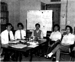 研究室員(5人)を紹介しよう。鈴木主任研は大 型アンテナ組立技術、ミリ波共同研究の主担当者と して、さらにETS-Y本部の副主幹として活躍して いる。メーカーやNASDAとの打合せで外出する仕 事が多く、好きなテニス(所内ではトップクラスの 腕前)も御無沙汰がち。パソコンを使わせたら有本 主任研の右にでる人はいないであろう。専用のコン ピュータをあたかも自分の脳の一部のように扱い、 困難なシミュレーションをいとも簡単に行ってしま う。最近は、光学追尾による静止衛星の高精度位置 決定の研究もスタートさせた。高橋研究官は、組合 の支部長としての活動と研究(特に大型アンテナ組 立技術)を見事に両立させている。多忙のため、体 が資本との自覚から、最近は節煙に努めている。最 近企画課から移った吉門主任研はプラズマ工学の専 門家であるが、“光関連の研究を零から出発してや りたい”と意欲を燃やしており、その意思に敬服し ている。最後に有賀(著者)は、特に上記省際研究 のリーダとしての雑用が多く、趣味のゴルフも練習 不足気味でスコアもいまいち。皆各々忙しい毎日を 過ごしているが、新しい宇宙技術の研究に取組み、 将来を夢見ており、表情は明るい。
