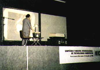 第2会場は「エコテック(ECOTECH)」と呼ばれ リオセントロヘの途中にある。荒れ地を均して急造 したと思われ、中庭を挟んでしゃれた回廊がある1 〜2階建てで、大小かなり多くの会議場や展示スペ ースがあり、技術移転、環境技術、エネルギー、ア マゾン地域の開発、ゴミ問題などの多彩なシンポジ ウム、パネルディスカッション等が行われるほか、 企業などの展示が行われていた。