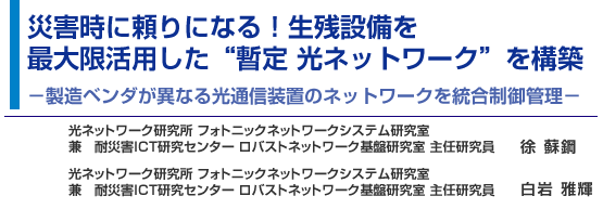 損壊を免れた生残設備を活用して光ネットワークを構築できれば早期に光ネットワークサービスを暫定復旧できることに着目し、平常時は決して接続されることのない、製造ベンダが異なる光通信装置を協調動作させて光ネットワークを構築する「ネットワーク統合制御管理システム」を開発しましたのでご紹介します。