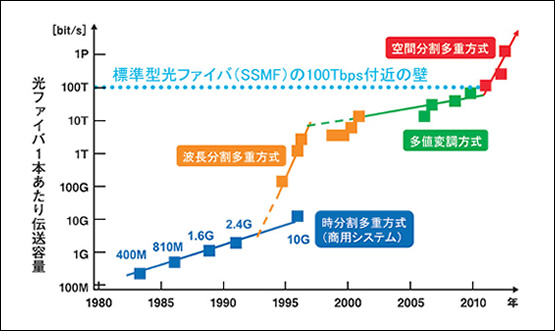 光通信の黎明期には、時分割多重方式(OTDM: Optical Time-Division Multiplexing)によって、通信速度の向上が図られていました。これは主として、送受信機の電子回路の高速化によって実現され、その技術的な性質から、いわゆるムーアの法則に従うものと考えられていました。しかしながら、複数の波長の光信号を1本の光ファイバで同時に送受信する波長分割多重方式(WDM: Wavelength-Division Multiplexing)が出現するとともに、複数の波長チャネルを同時に増幅する光増幅器の実用化によって、光ファイバの利用可能帯域は一気に増大し、折しも世界規模で発展していたインターネットの膨大なトラヒック要求に対応し、年率2倍という驚異的な容量増加を達成しました(図1)。
