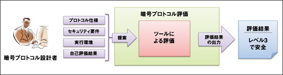 図1 暗号プロトコル評価の基本的な構成(図をクリックすると大きな図を表示します。)
