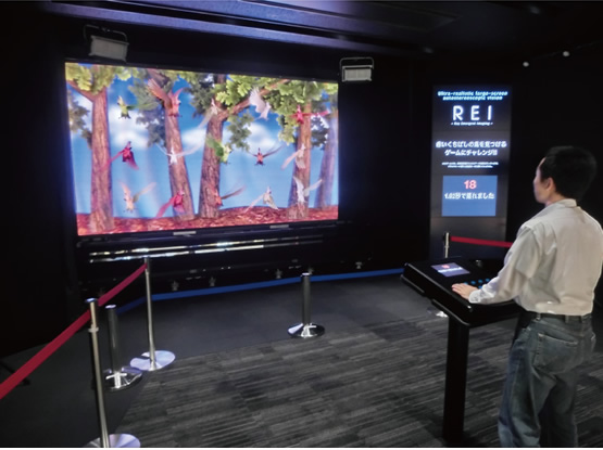 現在、200インチ裸眼立体ディスプレイ(REI)をJR大阪駅北側のグランフロント大阪のナレッジキャピタル内The Lab.の3階において常設展示しており、立体音を伴ったコンテンツとしてバードウォッチングゲームも展示しています(図3)。また、この展示コンテンツを用いた臨場感評価実験も同時に実施しています。