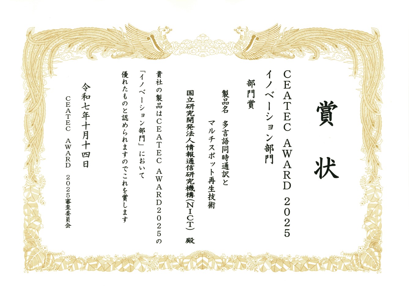 CEATEC AWARD 2025において、当機構の「多言語同時通訳とマルチスポット再生技術」が「イノベーション部門賞」を受賞いたしました。