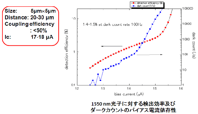 当研究プロジェクトは未来ICT研究センターナノICTグループ・超伝導チームと共同でNbNナノワイヤーを用いた単一光子検出器の開発を進めています。この検出器は低暗計数高速動作という特色をもち、また化合物半導体単一光子検出器で必要とされているゲート動作が必要ないため,量子鍵配送の検出器としての応用が期待されています。
