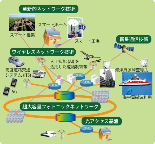 これらの技術により、IoTの時代に求められる超大容量のネットワークシステムや、異種ネットワークの統合に必要なワイヤレスネットワークの制御・管理、高速化・大容量化を実現するグローバル光衛星通信ネットワークなどが可能となります。